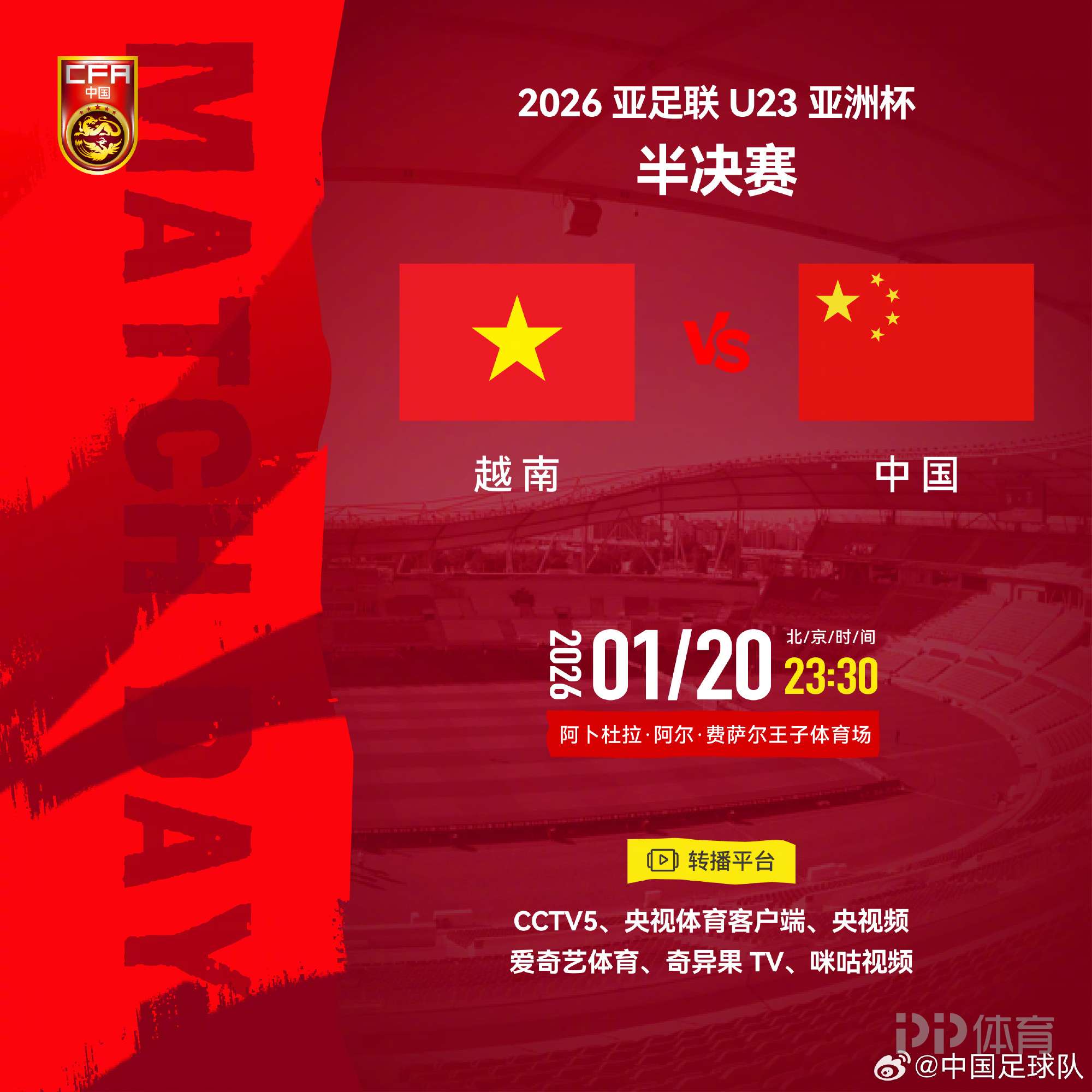 官方:CCTV5将转播U23亚洲杯半决赛:中国vs越南